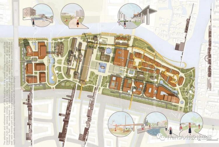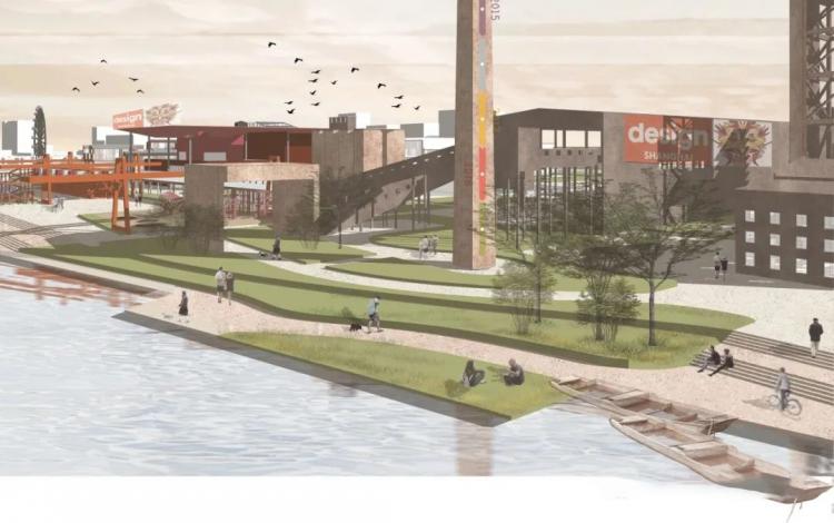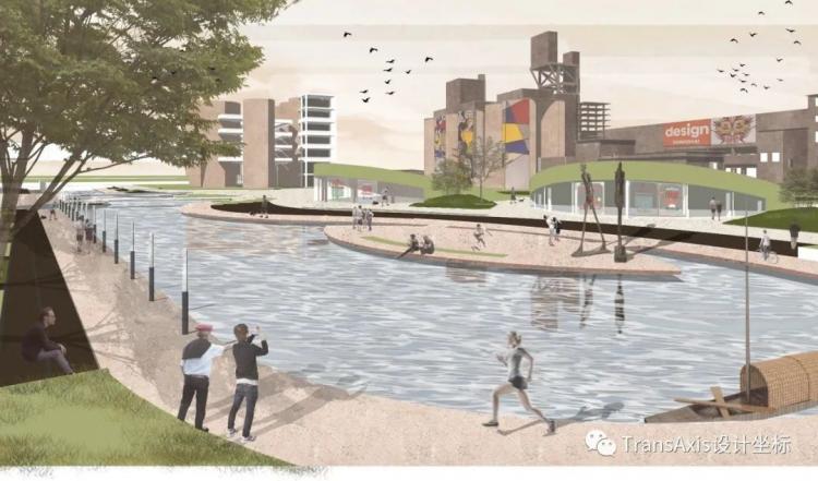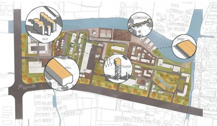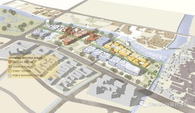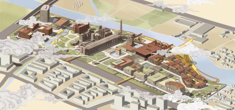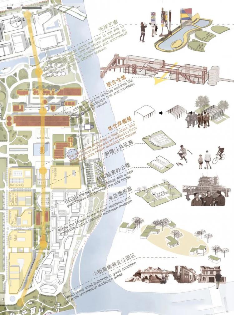 于是,改造后的功能区被排布出来,由西到东有星级酒店、集中总部办公楼、工厂遗址公园、滨河商业街、商业综合体、剧场、展览馆等等多样的、丰富的功能,其间穿插着两条自东向西的游览轴线供访客游憩。