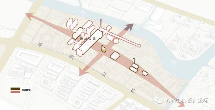 新增的网格状轴线中,最为吸睛的是两条十字交叉的轴线,它们既是串联入口到江边、东岸至西岸的主要路径,也是串联所有保留建筑形成完整“遗址公园”与“水岸游廊”的重要轴线。