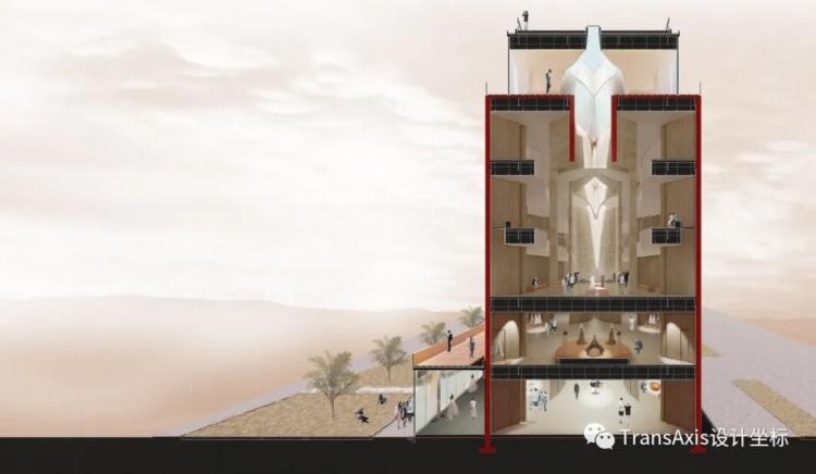 首先是创造视野和景观良好的筒体建筑之间的连接平台,其中部的空间也可以作为酒店大堂和交通空间使用。