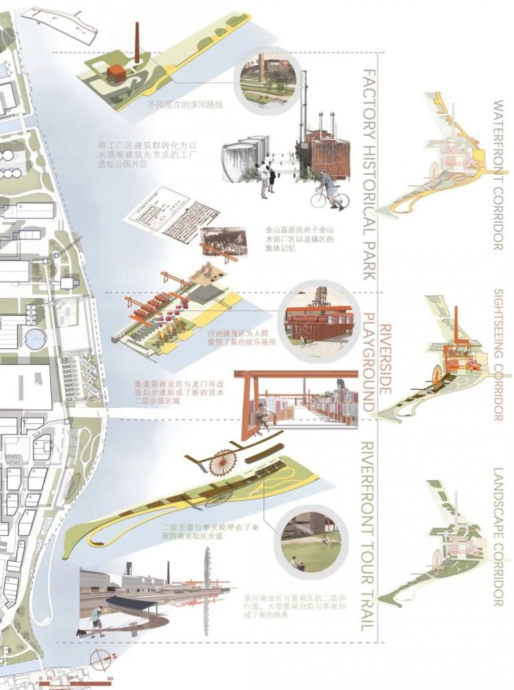 在我们的案例调研阶段,老师们曾提出过厂区更新后,会为金山区提供一个新的游览打卡地这样一个愿景。于是第二个方向我们就用了一个自“兴趣点”到“游览轴线”的逻辑,试图先通过打造场地内保留建筑中较为有特色的景观带,再将它们有机串联起来,形成新的游览路径。这一方案的优势在于充分考虑了重点景观驻留点的选址,考量了对水岸、工厂自身来说最具特色的游览方式,不至于使原本有趣的“打卡点”因人为轴线的置入而丧失活力。