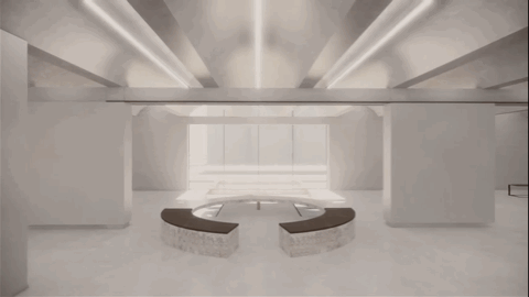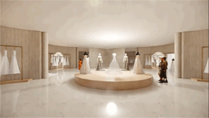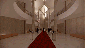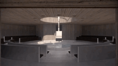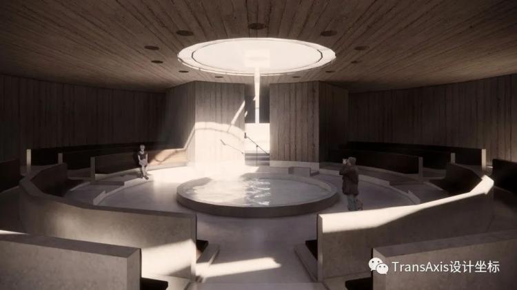 △ 这是婚礼教堂空间场景,站在中心能看到天光与婚礼主持舞台形成的仪式感画面,宾客可以从不同高度的看台见证神圣的婚礼仪式
