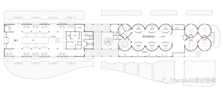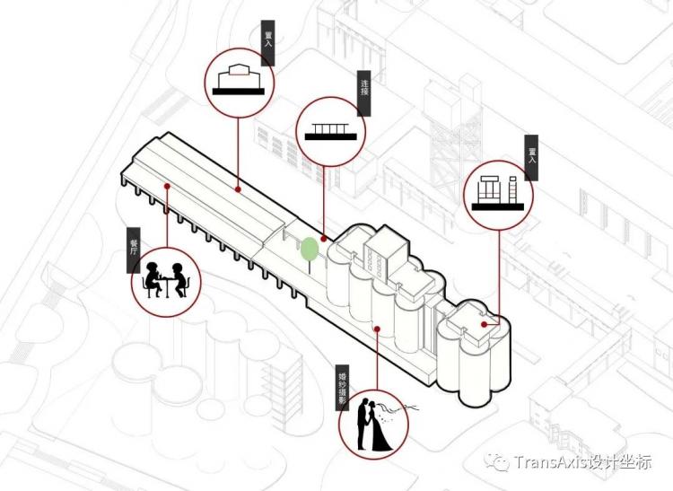 筒仓空间除了其弧形的墙面令人充满探索欲,其筒体重复的序列感也带有强烈的仪式感与纪念性。所以,筒仓建筑与婚礼教堂、摄影工作室、大型景观餐厅等充满仪式感的功能场景适配度也非常高。所以这个原用于包装产品的筒仓和北部厂房让人联想到了与婚礼相关的改造方向。
