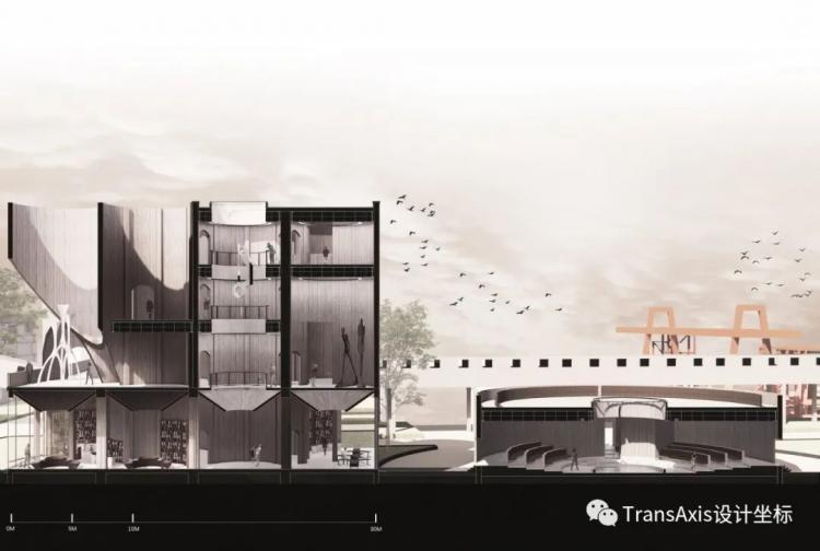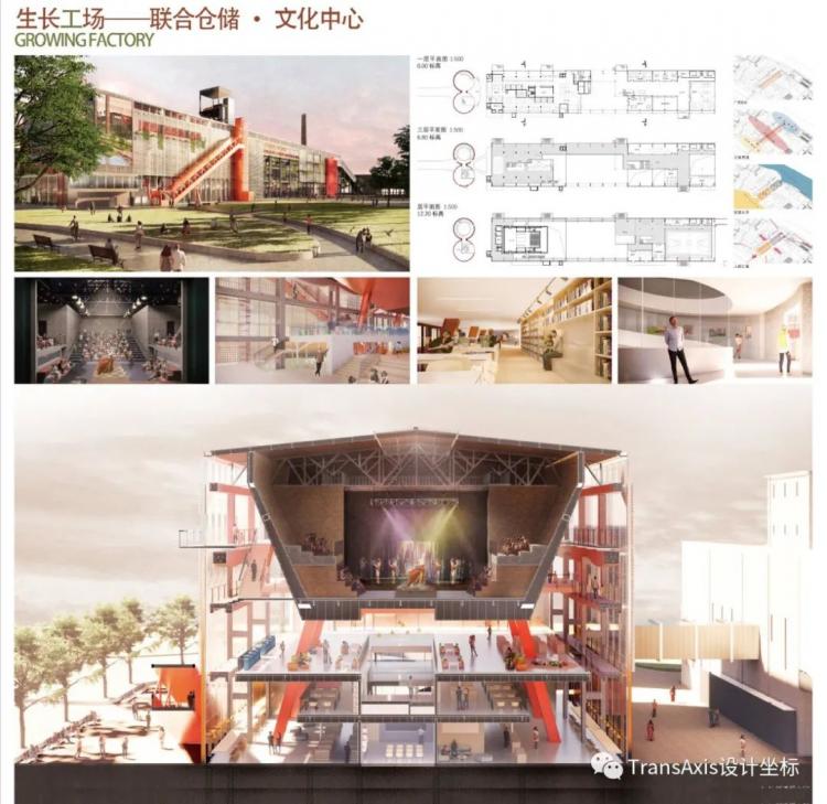 然后,开始对文体中心内部空间活力感的塑造,剧院、书吧、天光篮球场、中间的休憩庭院……一个极富社区生活活力的大型综合功能建筑逐渐被清晰地构成。回溯一下我们小组在城市设计阶段的功能定位,联合仓储的改造,成功地将外来游客与镇区居民的生活有机地结合起来,激活整个遗址公园的核心区域。