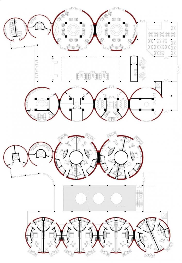 △ 各层平面,在表现上我们小组内统一了将保留下来的原有建筑结构用棕红色区分的方法