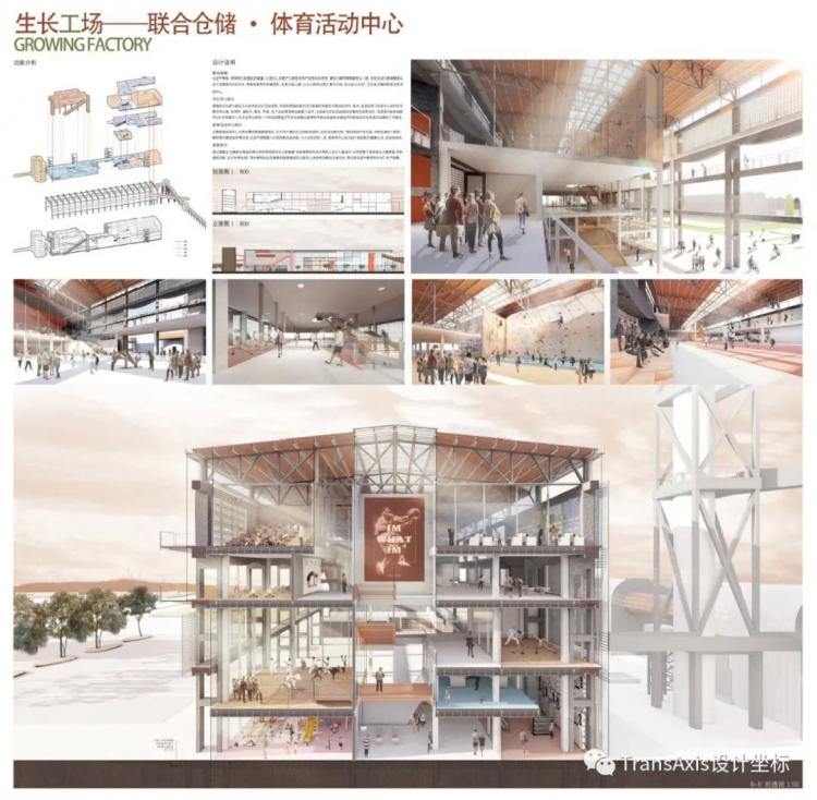 联合仓储是整个遗址公园部分体量最大的建筑,而且就城市设计的角度来看,它还扮演了衔接整个场地东西双向的桥梁的重要角色,故而最开始两位同学就分工为南北两个部分,合作塑造联合仓储两个部分——南部为文化中心,里面有书吧、社区图书馆、小型剧院等综合文化设施;北部为体育中心,里面有乒乓球、击剑、攀岩、篮球等各种丰富的体育功能场馆。中段为通透的交通庭院,丰富的空间体验把整个联合仓储的空间氛围活跃起来。