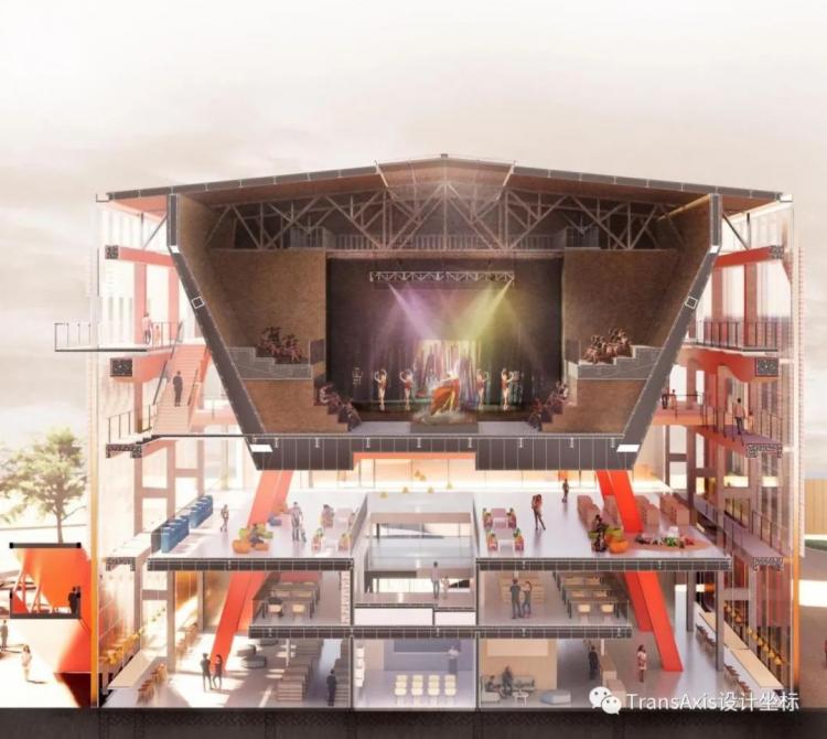 自与户外联通的入口公共空间进入文化中心,剧场置入的新结构被漆成较明艳的色彩,与原有联合仓储保留结构相互映衬。