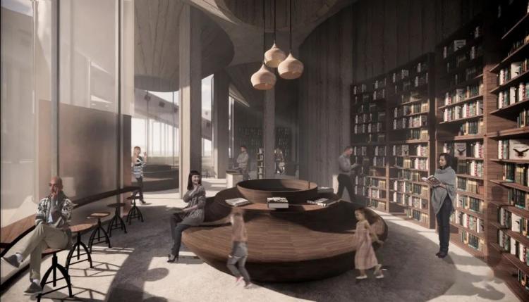 △ 筒仓展览馆一层的书吧,可以看到天花板保留的筒仓底部倒斗