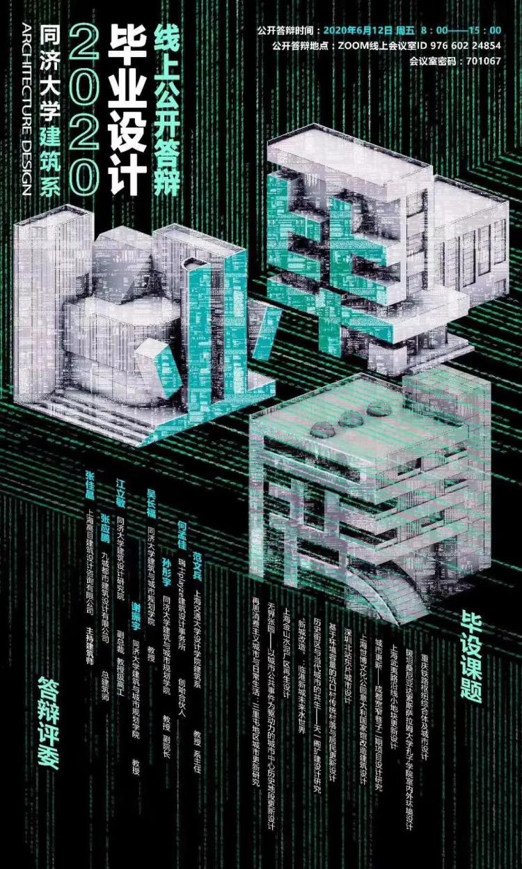 6月初我们匆匆迎来了线上评图。今年环境是如此的特殊,被沿用多年的同济大学本科毕业设计海报在今年也被设计成了“赛博风”。