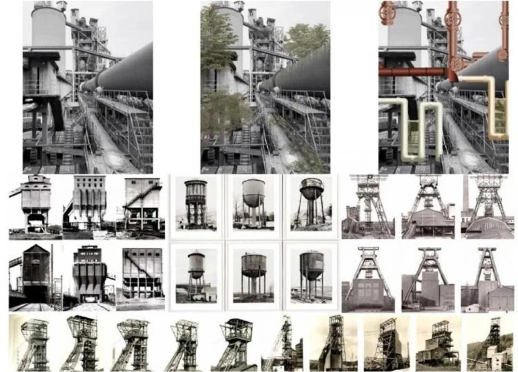 △ 上:本次工业建筑改造的精神策略核心“遗址公园;下:”贝歇夫妇与他们的《无名建筑》系列摄影作品节选