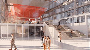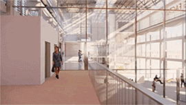 东西向开放的联合仓储中段,是一个视野通透景观良好的休闲大厅,置身其中可以感受到北面体育中心和南方文化中心的活跃氛围。
