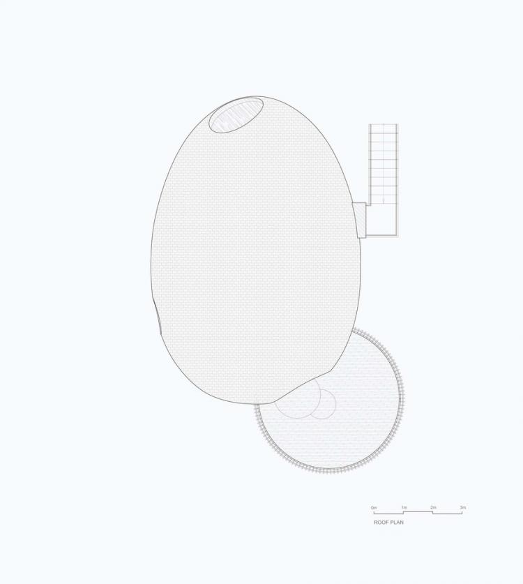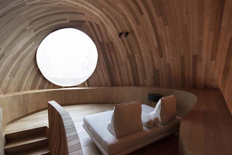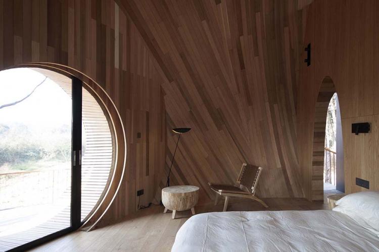 结合种子木屋的形态及空间需求,设计了多个圆形洞口,将室内的流线或视线引向不同的方向:建筑正面的圆洞通往露台,露台采用独立基础,如同漂浮着的一块小圆石,现存的大树穿透露台,提供荫蔽;侧面的圆窗面向疏朗的树林,阁楼上的大圆窗则对着天空和高树的枝桠。