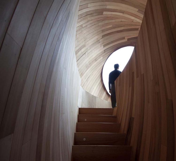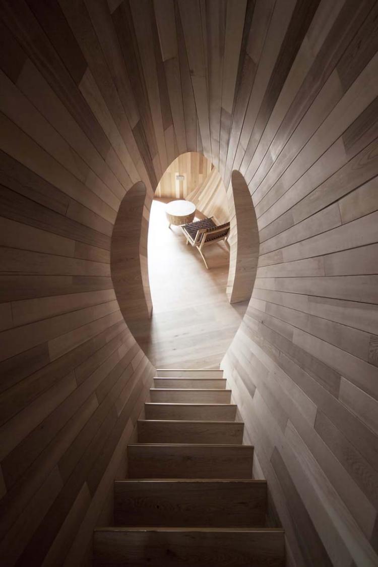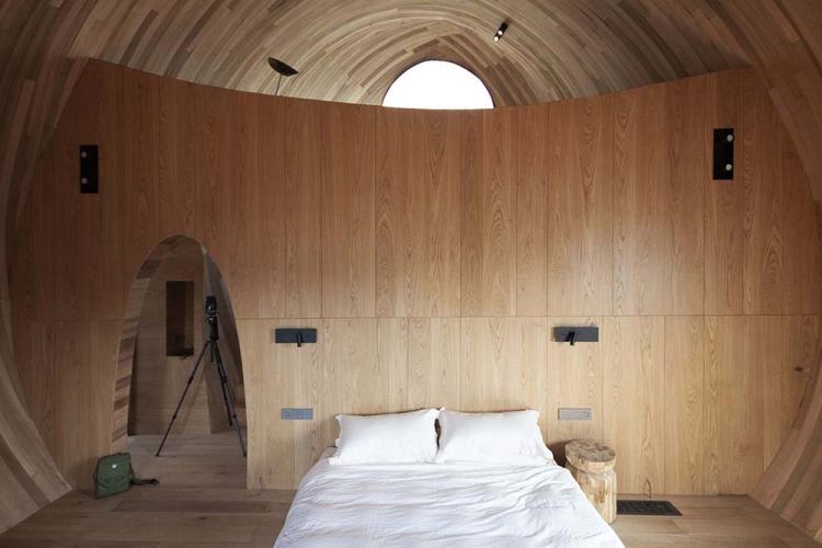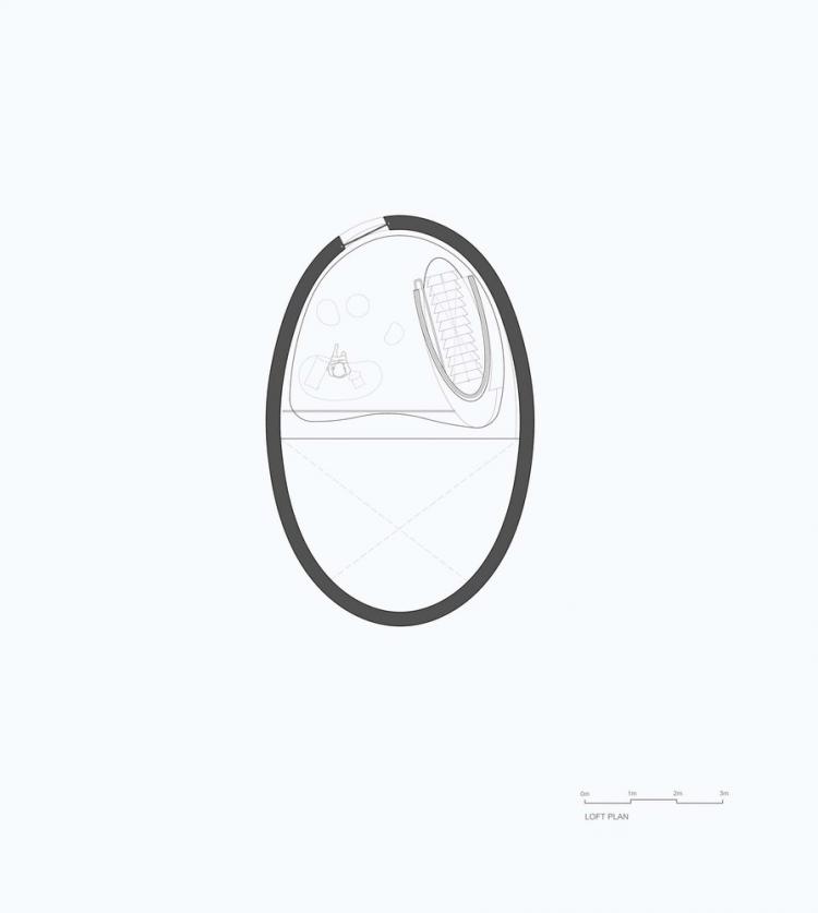 种子屋室内墙面采用统一的木拼,自然的木色变化形成的条纹感,进一步强调椭球形态的空间感。主卧后侧体量容纳入口、卫浴、储藏等功能区,同时形成亲子区阁楼。阁楼与一层通过一个插入式的椭圆柱型楼梯间连接,同时楼梯间与入口空间穿插,形成有趣的异形空间。