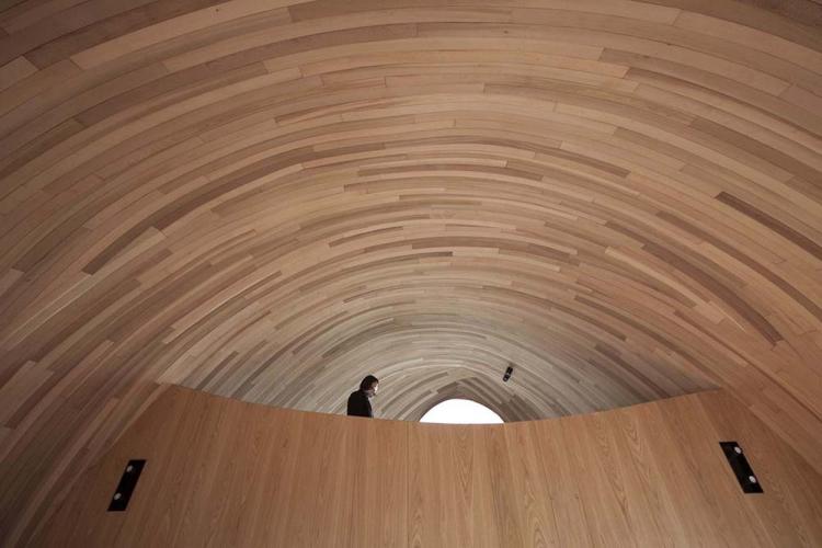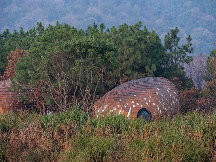种子木屋整体呈椭球形,底部采用镜面铝板,往高处渐变为木瓦。镜面铝板随着季节、天气的变化,反射周围的环境和氛围,冬季时是红土地,春夏季时是绿植,潮湿时是氤氲雾气,晴天时是明媚阳光。镜面铝板是种子屋落地生根的部分,上部的木瓦则使建筑逐渐回归自然柔和的本质。