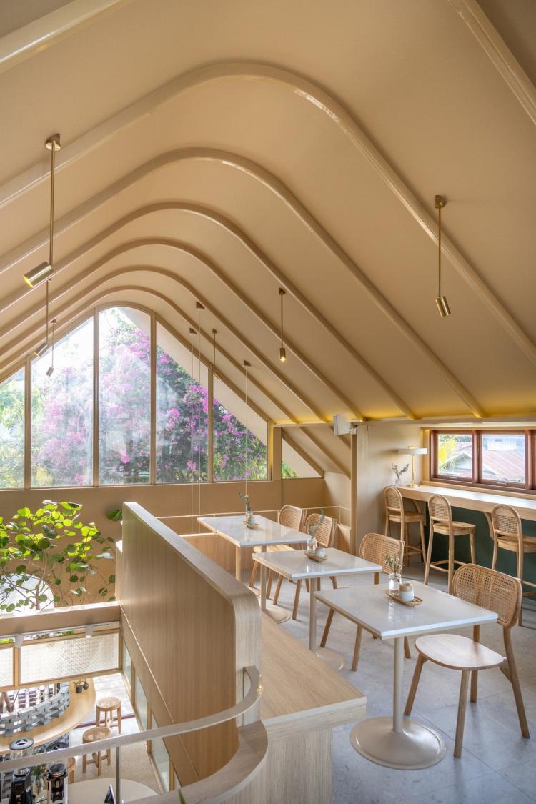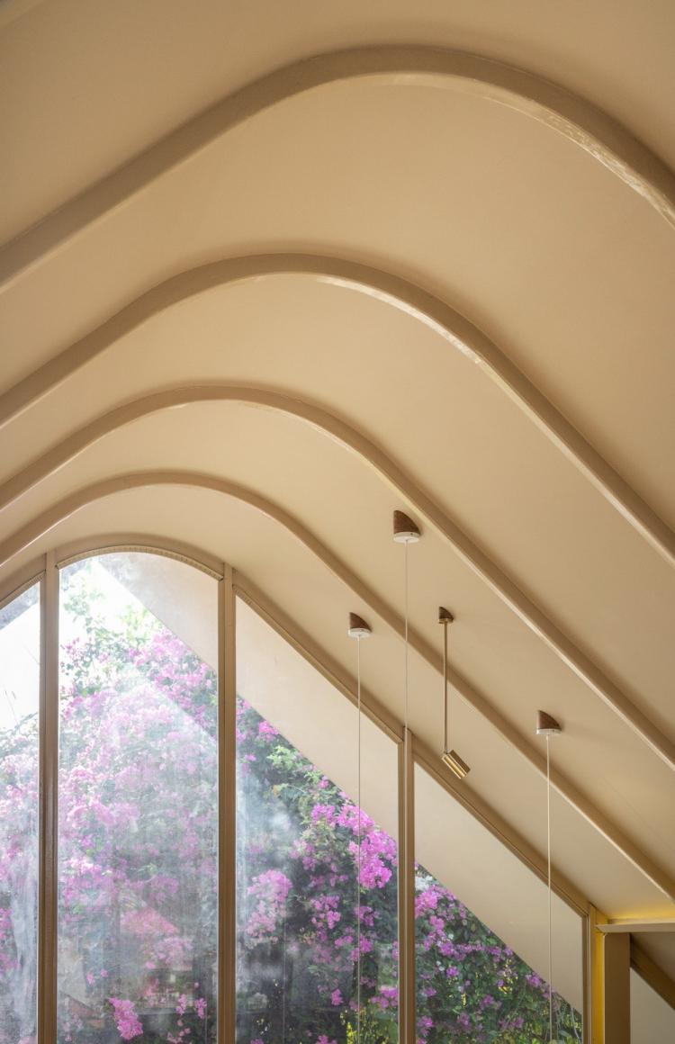 上层的室内空间有着独特的屋顶线,其弧形天花板的设计灵感也来源于棕榈树的几何形体。