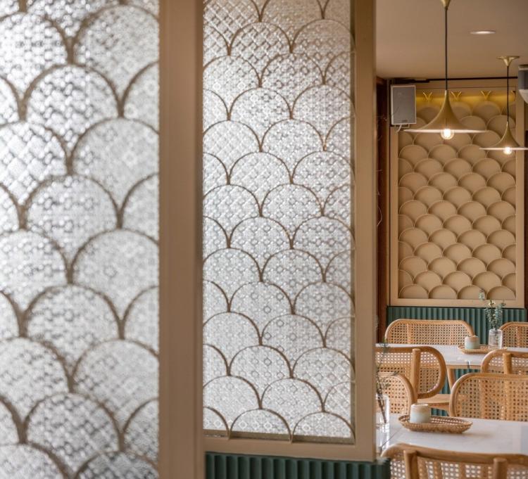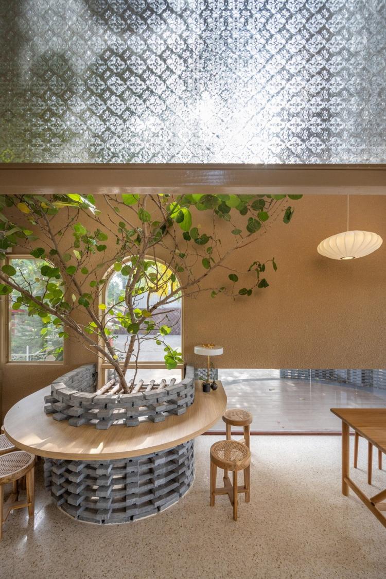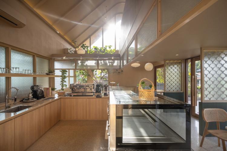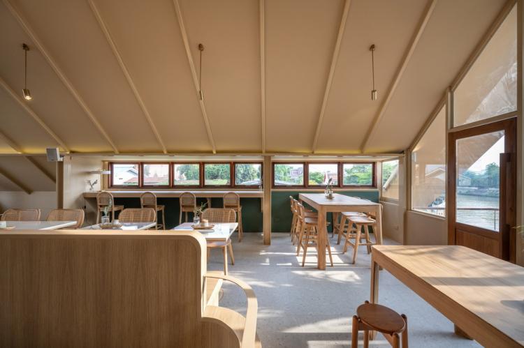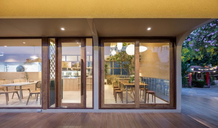 为了让客人可以专心于品尝食物,店铺的正立面主要由不透明的元素打造,这样的设计也打开了餐厅俯瞰庙宇、滨水社区和交错河流的视野。