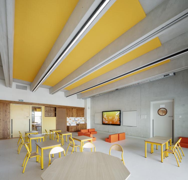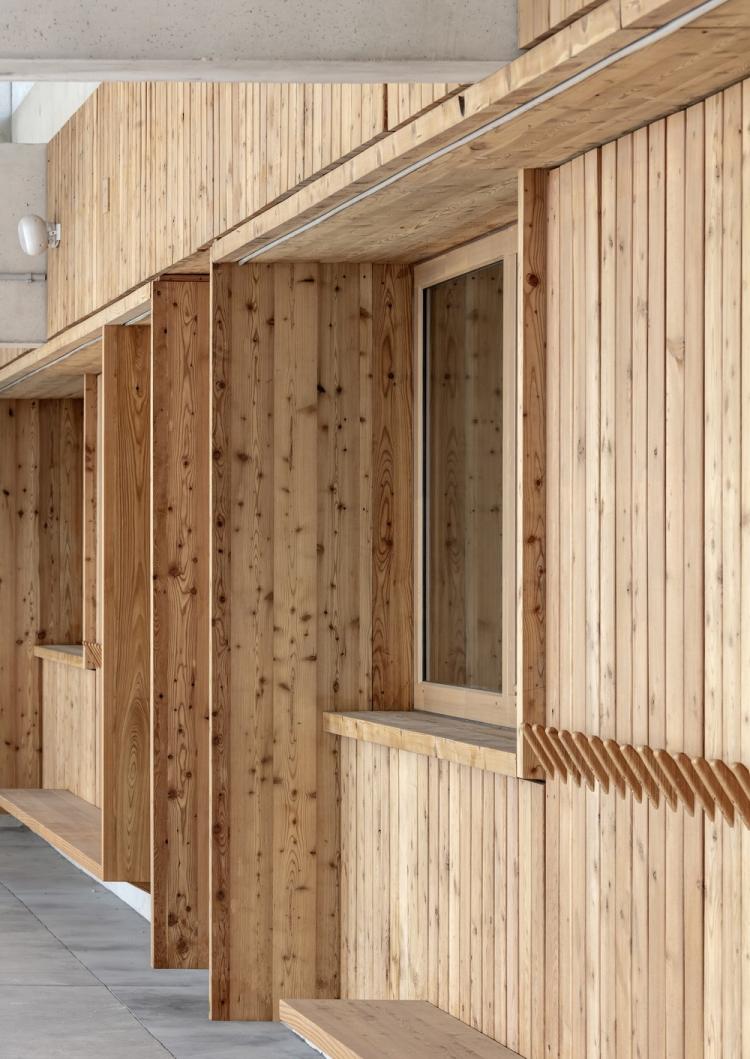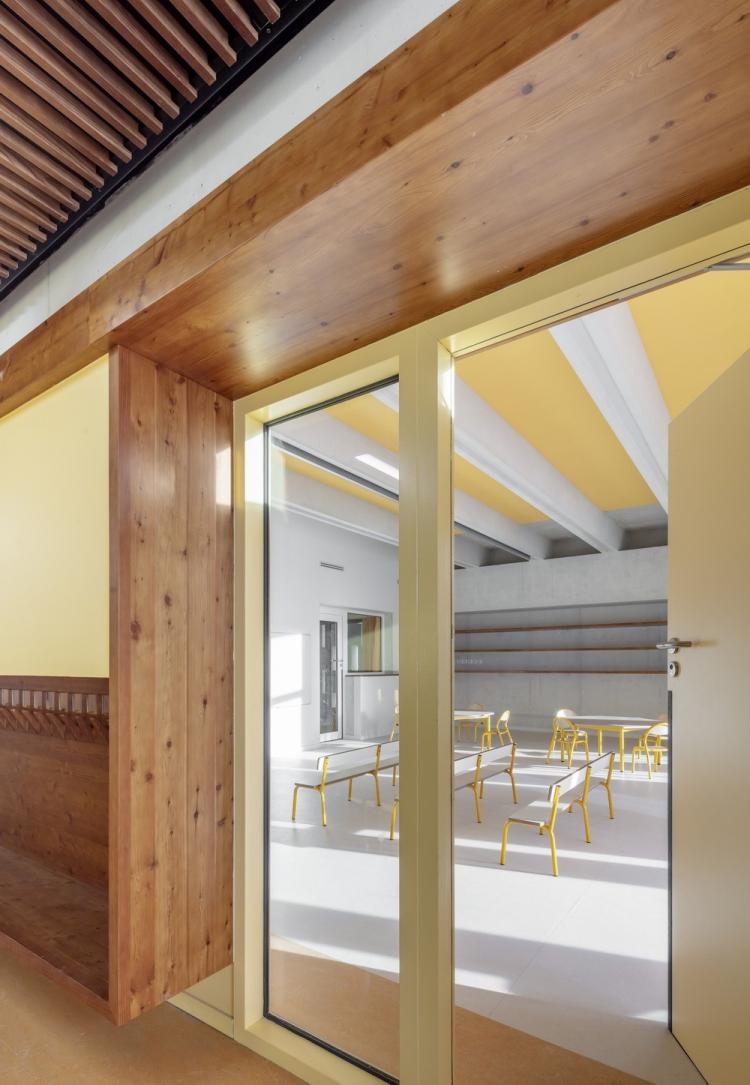 这种木材是来自阿尔卑斯山的生物源落叶松,谨慎克制地用于覆盖着木板的主要墙面,教室和环形走廊之间的玻璃,以及内置的家具。