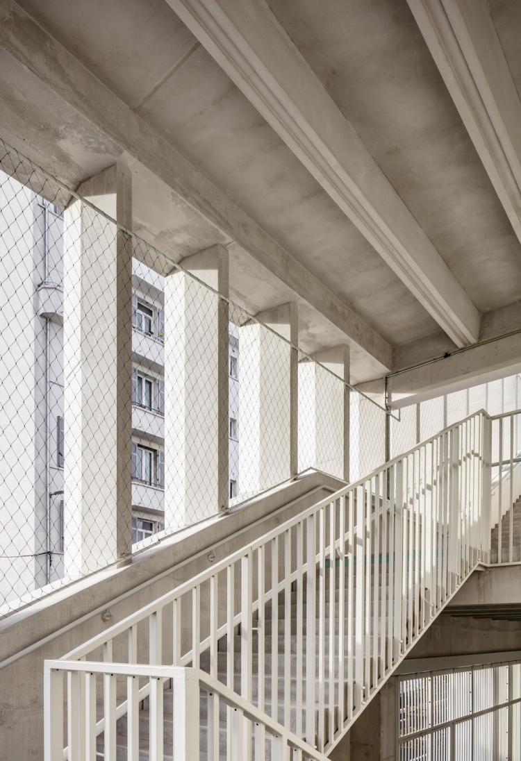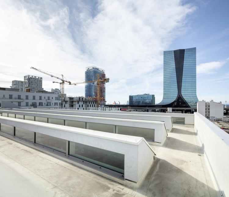 它的浅色混凝土立面采用雕刻塑造,这种厚度的镂空作品在港口一侧形成了柱廊,在城市一侧形成了宏伟的楼梯,在其斜墙中创造了光与影的相互掩映。
