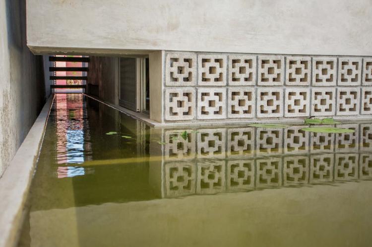 在住宅前面有一个L形的环建筑水池,水中含有抑制蚊虫的药物,并且这个空间通风良好能进行一些休闲活动。