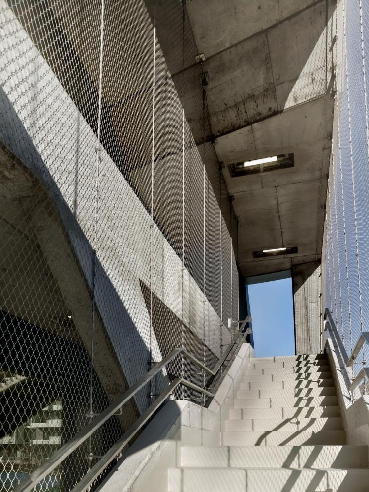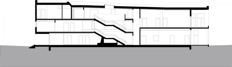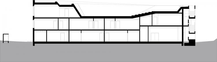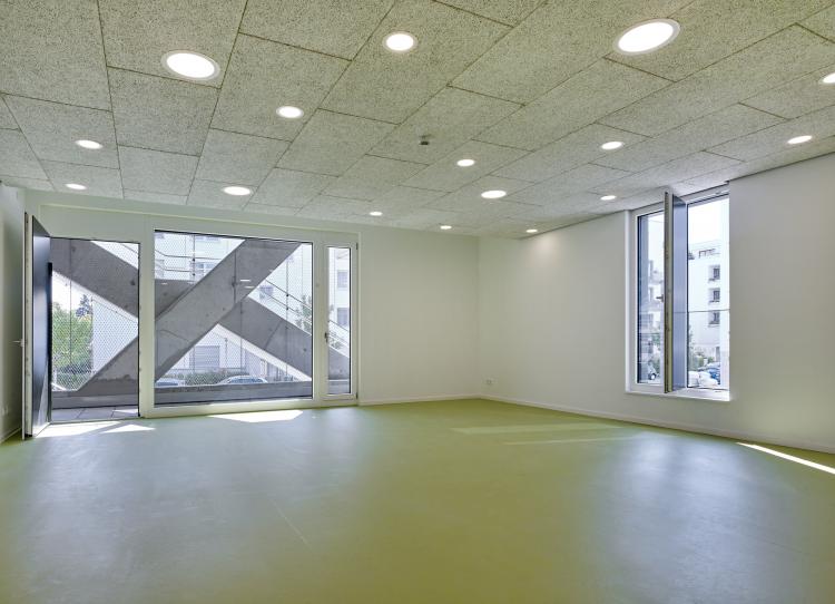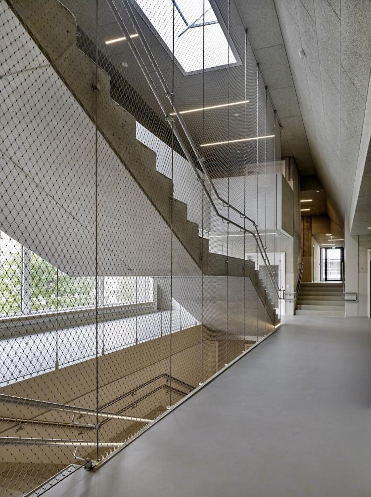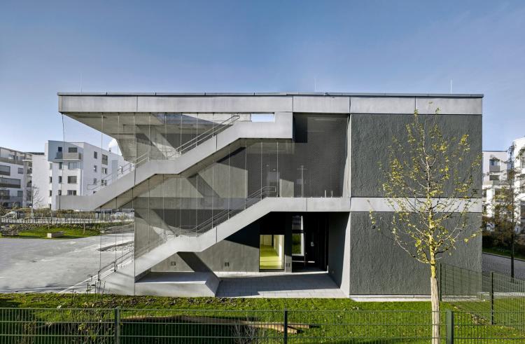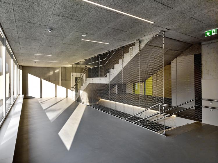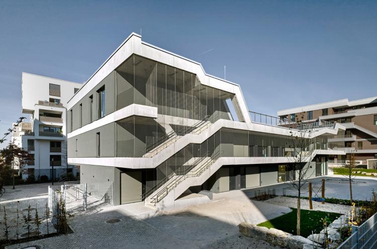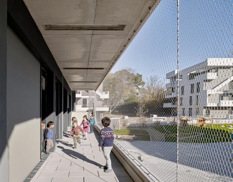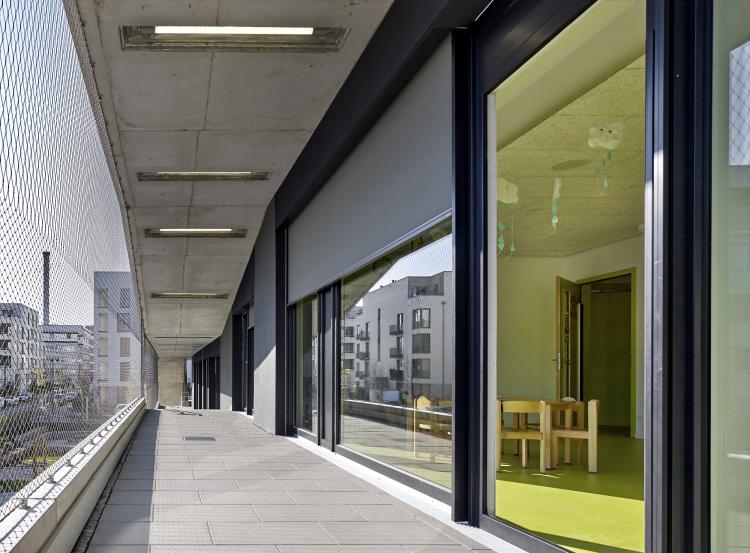 多层的混凝土同时也是立面设计的亮点之一。在层与层之间加进了实心的高性能保温材料。北部面向一条长廊,建筑从外部看更加闭合——只有底层的游乐场地可以通过玻璃幕墙对外部可见。阳台和拱廊都添加了不锈钢材质安全防护网。