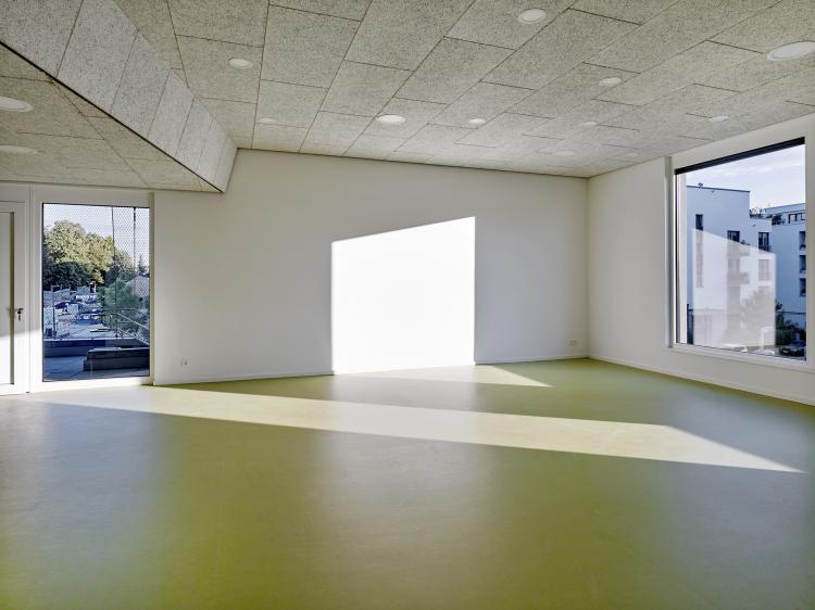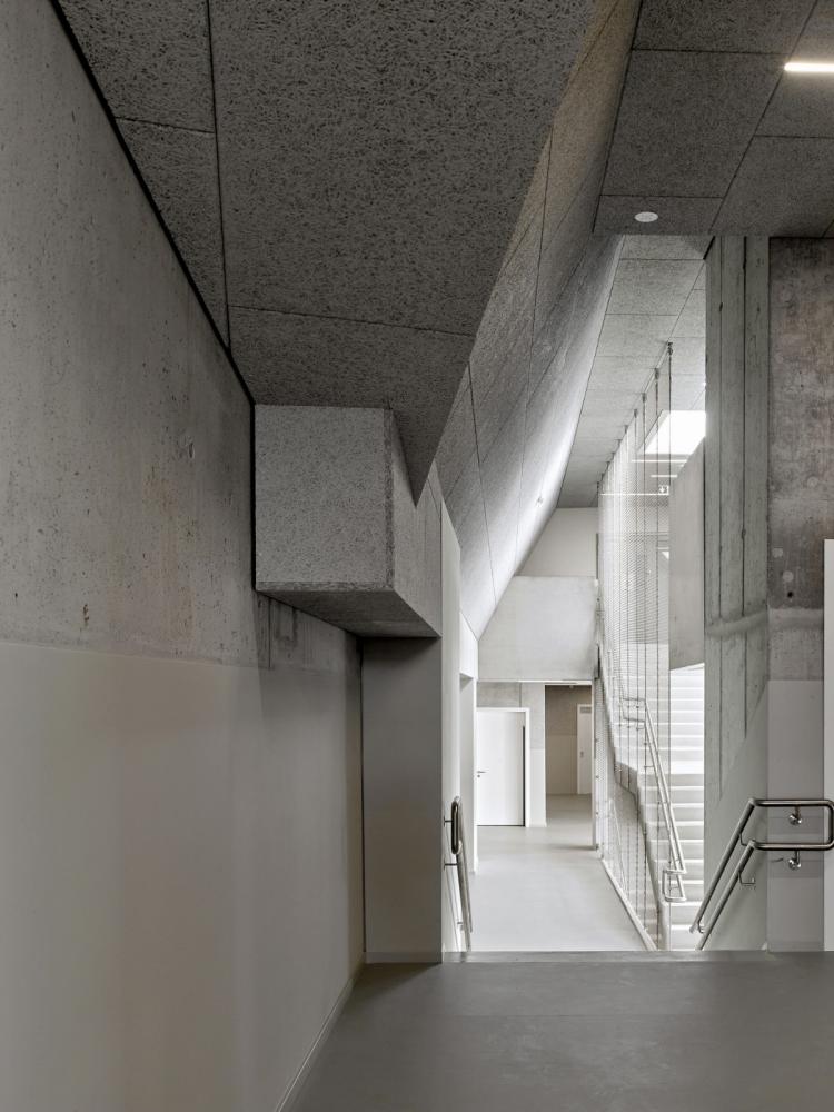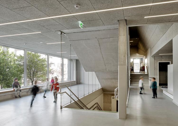 在室内,一个中央通道加上多个有遮盖的走廊鼓励孩子四处走动。这些走廊及与之相连的楼梯,均由清水混凝土作主要材质,形成了一种从室外到室内的自然过渡。这些空间上的过渡坐北朝南,面向一个大型花园。同时,突出的拱廊可以防止阳光直射,从而避免了夏季室内过热。这也让从室内到室外的动线免受风雨的困扰。