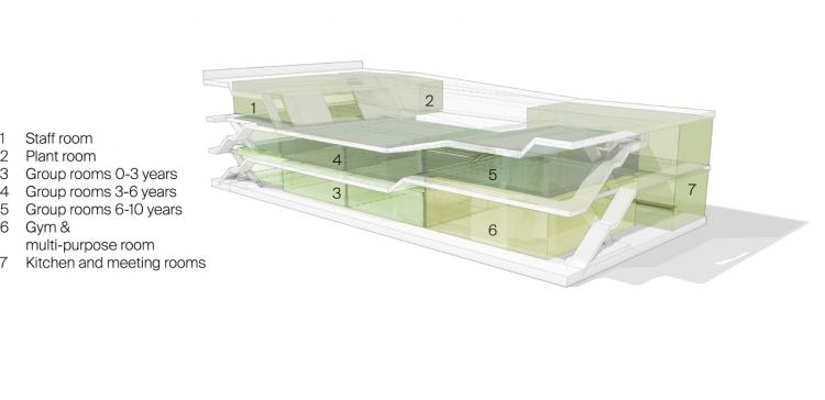 严格来讲,建筑包含了两个主要楼层以及一个屋顶区域。这样提供的空间可以给三组婴儿(0-3岁)、三组幼儿(3-6岁)和两组少儿(6-10岁)使用,总计可容纳142名儿童。换句话说,这个新建的幼儿园不仅可以满足当地社区的需求,还可以在更广的城市范围内提供服务。