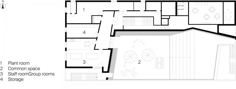 这些通道所直接相连且充满阳光的是明亮的儿童活动室。职工办公室则位于建筑的北端。