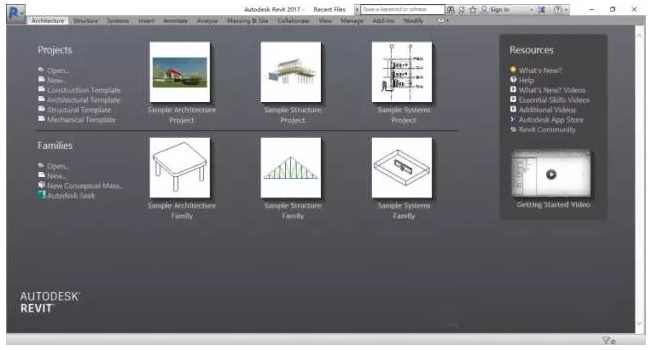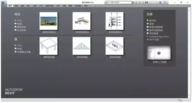 在通常情况,我们安装好Revit2017软件后,打开时,会出现与下图相似的界面(本例中,根据个人需求样板文已经更改)