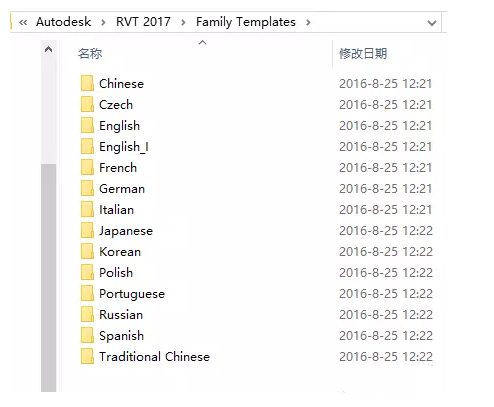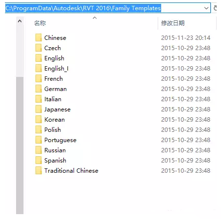 打开Revit2014、2016、2017(Revit2015版本也有多种语言版本):C:ProgramDataAutodeskRVT 2014(RVT 2016、RVT 2017)Family Templates链接