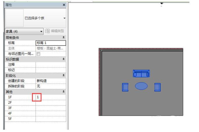 2.打开标高1视图,选择所有家具。在属性面板可以看到新添加的参数“1F、2F、3F……”。