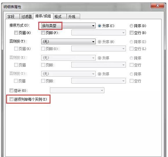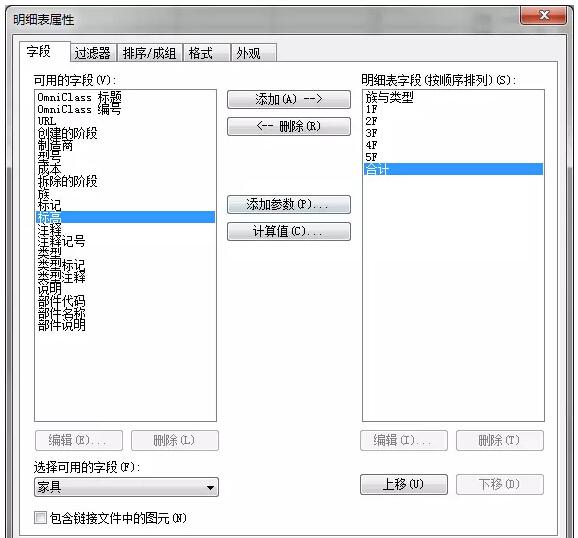 3.新建家具明细表,字段、排序、格式等具体设置如下图。