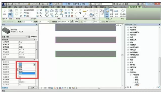 4、一个简单的排烟系统就创建好了,进行风管创建,点击风管——系统类型——排烟系统已经自动显示在里面了,进行绘制。