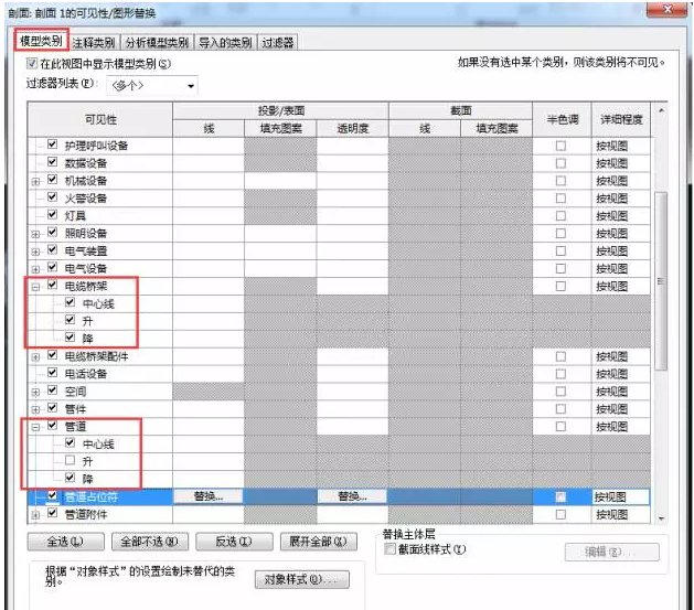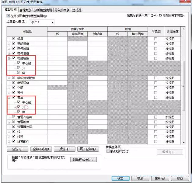 4.打开“可进行/图形”对话框,发现管道(电缆桥架)中的“升、降”命令均处于使用状态
