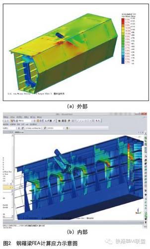 采用BIM三维模型直接对接大型有限元计算软件,完成桥塔锚固区应力分析、混凝土梁段应力分析、钢箱梁细部构造应力及方案优化研究等,体现了应用BIM平台正向设计铁路桥梁的优势。潭江桥钢箱梁模型导入FEA计算应力示意见图2。