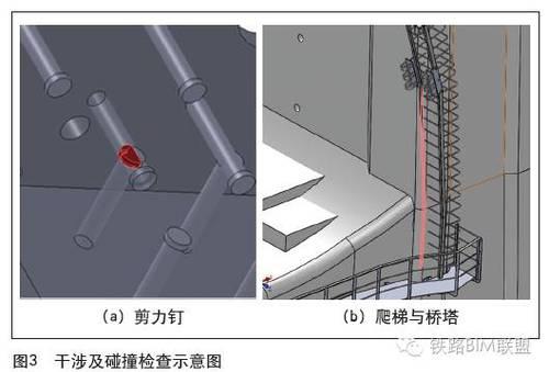 在潭江特大桥中应用软件的碰撞检查功能(见图3),检查钢混结构段中钢板剪力钉冲突及附属结构爬梯嵌入桥塔实体情况。