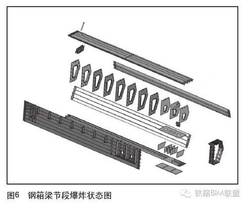 桥梁三维BIM模型除了能直观展示各构件空间位置及组装形式,还可以引入时间因子,将BIM模型拓展为4D模型,即按现场实际施工工序模拟桥梁桩基、墩台、梁部及桥面附属等结构的逐步施工过程。在潭江特大桥BIM设计中,应用Solidworks软件的爆炸功能模块清晰直观展示了钢混结合段、钢梁段中各钢板构件的拼装、焊接及混凝土浇筑顺序,在模拟施工方案、优化施工工序方面体现出显著优势。潭江特大桥某钢箱梁节段爆炸状态见图6,动态回溯可演示该梁段的完整拼装流程,且拼装视频能用于指导工人施工操作、安全培训等。