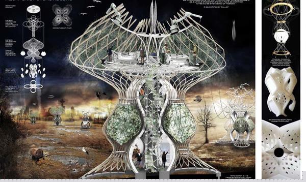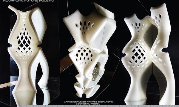 同时,这些植物为里面的居住者创造了一个健康、绿色的生活环境,这提供了一种逃离当今糟糕的城市空间的方式。据Chiriac解释,选择3D打印也是出于这样的逻辑。“建筑使用新颖的结构建造,这就要求使用轻量的活性弯曲的水培塔,里面有成长的农作物和鱼。”在这个塔中嵌入3D打印的居住单元,打印的材料源于室内的植物淀粉做成的生化塑料。未来这种灵活的房子将由Rep-Rap3D打印机打印成型,建材则是机器人制造的碳化加强的生化塑料棒和压制成的生化塑料板。