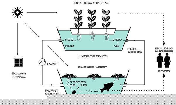 解决问题的关键在于,他创造了一个闭环的水培系统,是一个水栽培和水养殖的共同体。这个三层级的3D打印的房子本质上是一个水培环境——在上面带有水槽的种植床上进行无土栽培。水槽里还可以进行水产养殖,里面有食用鱼。鱼缸的废物(包括植物做成的食物的残余)转化成植物需要的富营养盐,从而形成一个食物链的闭环。事实上,相比于其他的农业形式,这种形式每平方英尺会生产更多的食物。