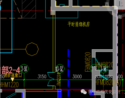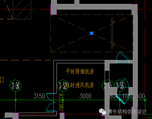 b.此处暖通机房较大,经核查发现机房压缩后足以布置风机和风管;经设计优化后可以增加车位,给业主带来直接的经济效益。(详见下图)