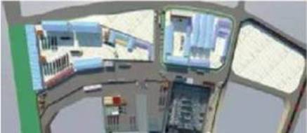 同时进行整体施工场地模型搭建,包括运输车辆、塔吊布置等信息,并将住宅模型整合进施工场地,如下图所示,
