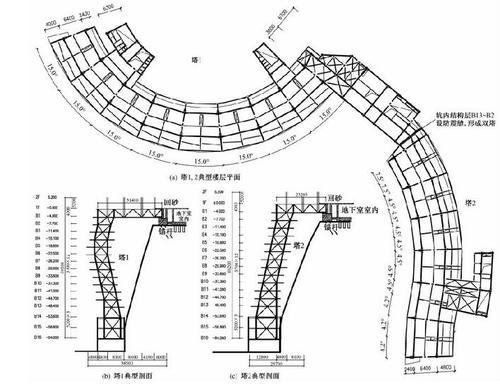 地下至水面的建筑依崖壁建造,坑内各楼层建筑平面中部为竖向交通单元,两侧均为圆弧形曲线客房单元。坑内建筑平面狭长且呈现L形,抗震计算时位移比等参数较难控制,因此设计中将竖向交通单元和左侧圆弧形曲线客房单元连成整体,和另一个圆弧形曲线客房单元设置防震缝分开。两侧圆弧形曲线客房单元沿径向的竖向剖面也呈现不同的曲线形态。