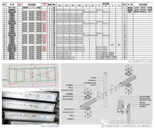 与普通幕墙生产相比,复杂幕墙单元的型材长短不一、面板呈非标准几何形状,给构件加工和管理带来困难,导致成本上升,以传统的流程需要增加5%以上的额外非标准产生的成本,且时间上无法保证。BIM的工作模式改变了这一流程:首先在建模的时候对“用户自定义特征”中的单元面板、龙骨框架、非常规型材这类构件依据数据规划进行唯一的编码2,计算机根据几何条件自动计算输入参数,装配出整体建筑的幕墙模型,而后通过程序提取数据产生料单。料单中对每根构件都有唯一的编号,通过编号下放材料加工、管理材料堆放,按标准单元模板图(图13)快速拼装单元。根据型材几何特点,与下游材料供应商沟通,以数据表(图14)、CAD文件、三维模型的形式下发生产料单。料单中的编号在材料出厂时要求厂家写在面板背面,这两年大型企业已经开始用条形码、二位码等标识单元(图15)。这样有利于材料进场时就近码放,安装前按排版图顺序摆放在地面上,对进场材料进行验收,也有利于安装时对号就位。