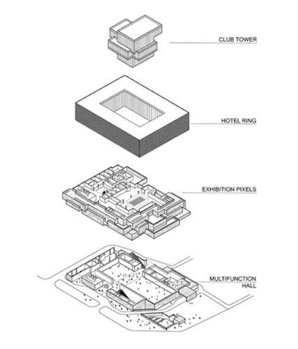 建筑下部像素化的体量从纹理、颜色和繁杂的规模与建筑周边的城市胡同肌理相融合,建筑上部则通过大尺度与北京现代城市相呼应与北京四合院产生共鸣。