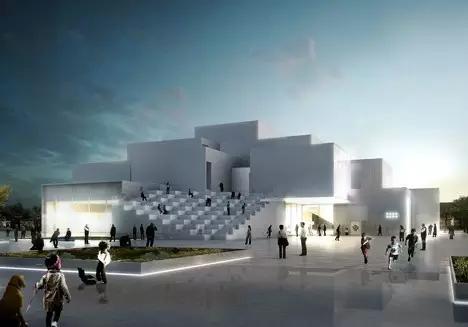 这座建筑有10万平方米的文化设施,包括影音室、电影院、图书馆、展览馆、博物馆和档案馆等。整个建筑的表皮被不锈钢管包裹,形状扭曲,就像沙漠中矗立的一块块巨石