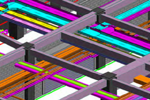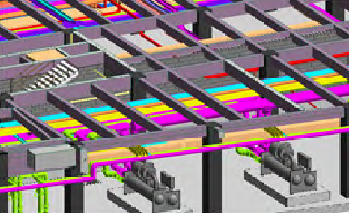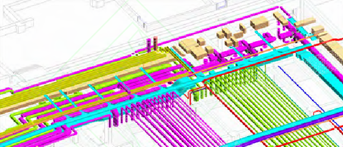 管线综合协调是碰撞检测的重点,运用BIM技术直观进行管线调整,满足业主对空间的要求和确保施工质量,最大限度地减少机电安装设备专业设计之间的协调错误。它能够以数据驱动的系统建模和设计来优化建筑设备与管道(MEP)专业工程。在深化设计阶段,自动解决管线之间的碰撞问题,合理排布管线(见图2)。