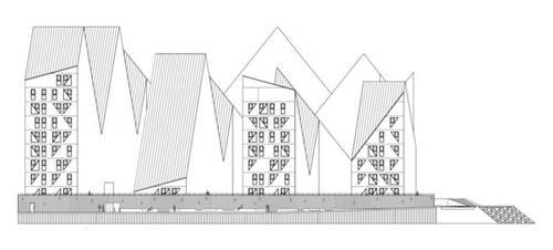 事实上,将最初围护的街区改成一座座小山,对于将来该地块或临近的住户来说,都是一种改善。第二排地块透过尖顶体块和锯齿状边缘获得了充分的海岸风景。这样当地政府也相信选择该方案将会带来更好的居住条件。[1]