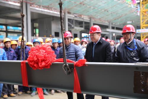 在最后的封顶仪式环节,北京建谊投资发展集团有限公司总裁张鸣、中冶京诚工程技术有限公司教授级高级工程师王立军、中国建筑金属结构协会钢结构分会副会长邓建国共同为最后一根钢梁披彩,完成吊顶