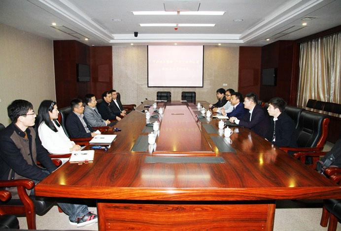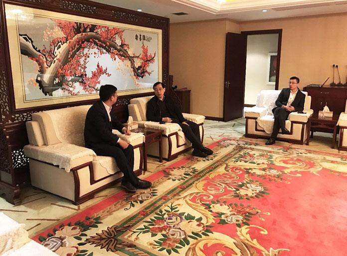 广联达科技股份有限公司副总裁、广联达宜比木董事长兼总经理汪少山(左)与南通华新建工集团副总兼总工程师钱忠勤先生(右)会谈