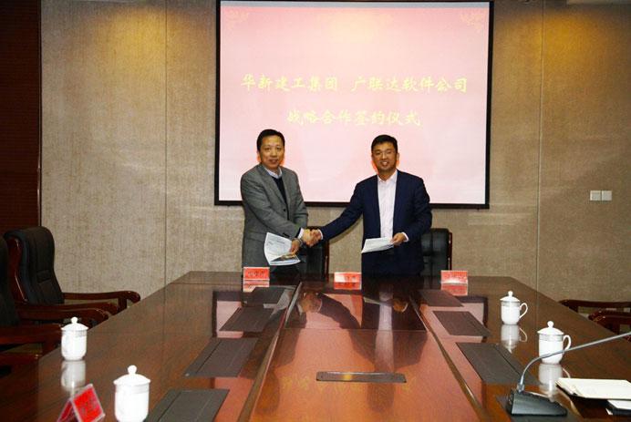 南通华新建工集团董事长陶宝华(左)与广联达科技股份有限公司副总裁、广联达宜比木董事长兼总经理汪少山(右)签约