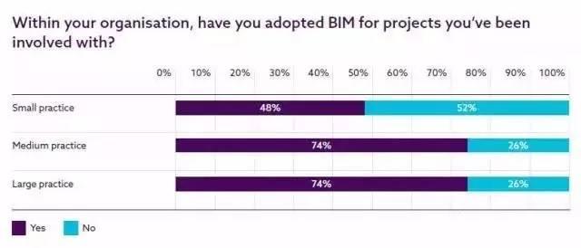 小公司(<15名员工)采用BIM的比较少——只有48%。而四分之三的中型(16-50名员工)和大型公司(超过50名员工)已经采用了BIM。