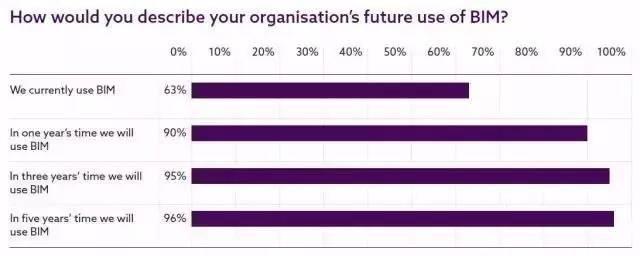谈到BIM的未来应用,90%的调查对象相信他们将在明年使用BIM,95%的人相信他们将在三年内使用BIM。尽管意图并不总能变成现实,但是过去6年60%的BIM应用增长,使得英国在下一个5年时间里BIM应用达到95%看起来是能够实现的。